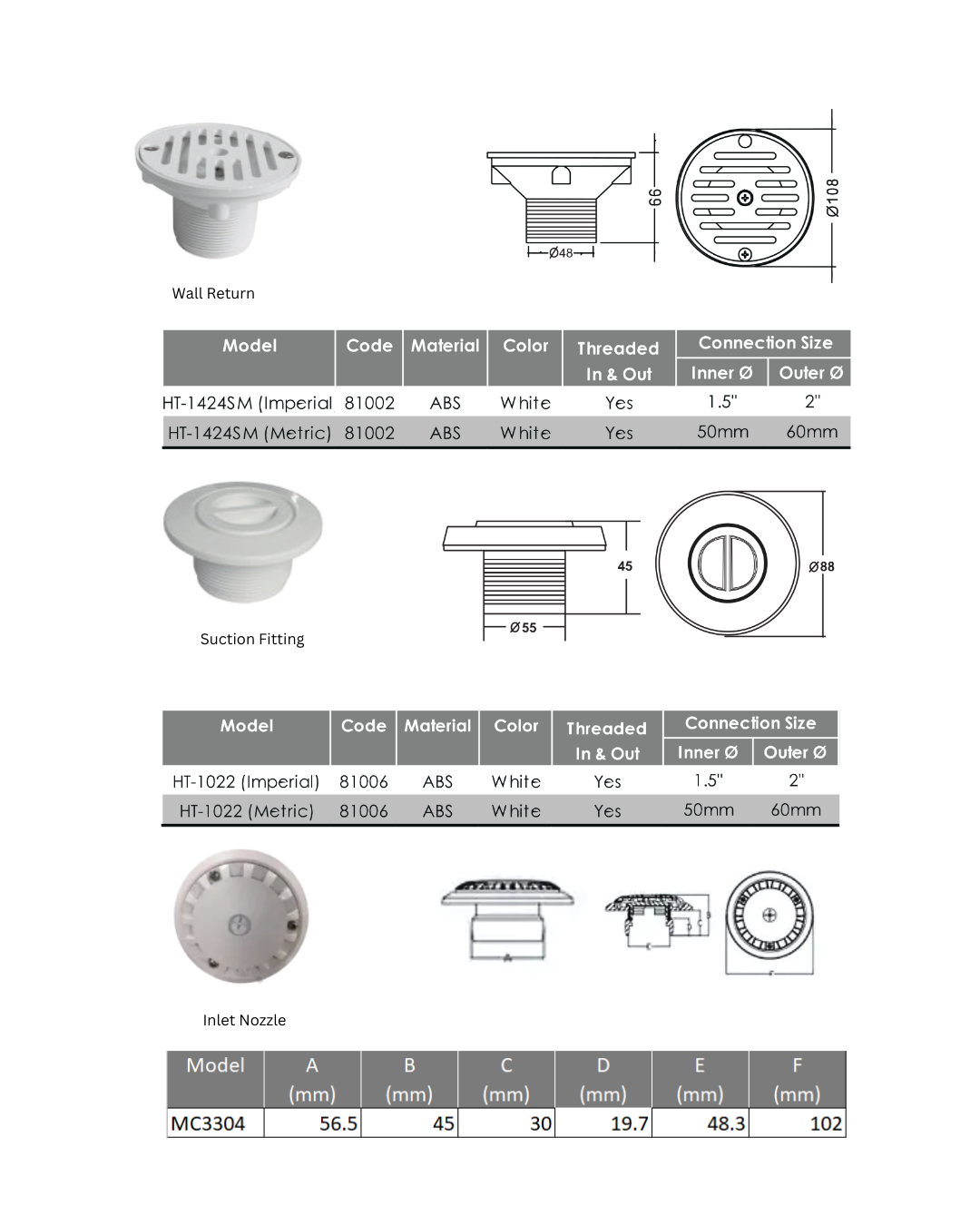 Inlet Fittings are essential components that ensure efficient water movement and optimal circulation across the pool. These fittings help maintain cleanliness, improve chemical distribution, and support overall pool health. The range includes wall return inlets, suction fittings, main drains, square main drains, auro vortex square main drains, floor inlets, eyeball wall inlets, and many more—each designed to serve a specific function and enhance the performance of the pool system.