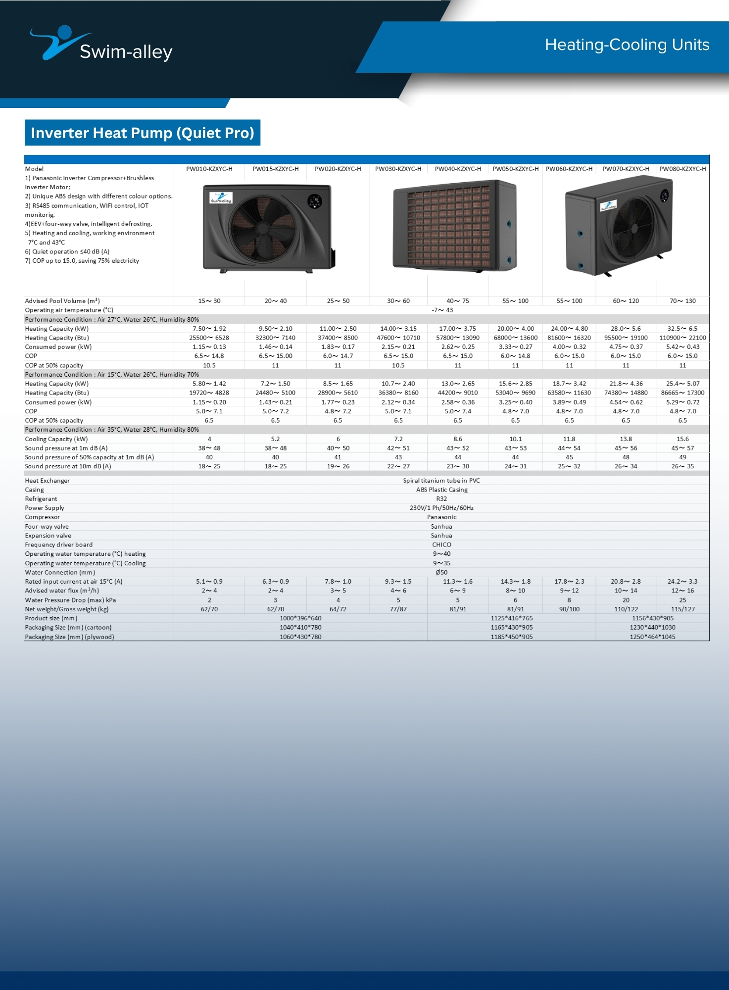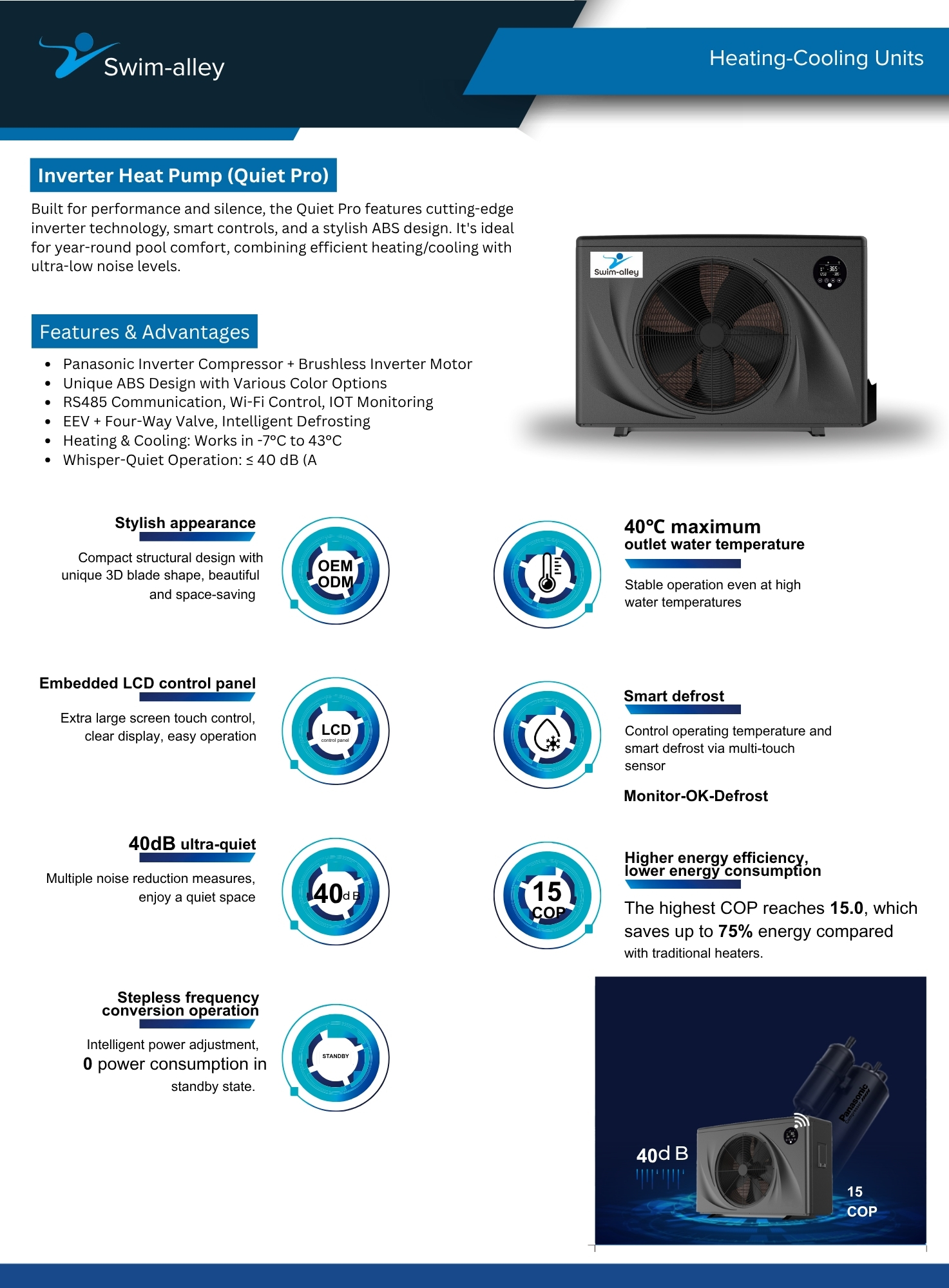Built for performance and silence, the Quiet Pro features cutting-edge inverter technology, smart controls, and a stylish ABS design. It’s ideal for year-round pool comfort, combining efficient heating/cooling with ultra-low noise levels.