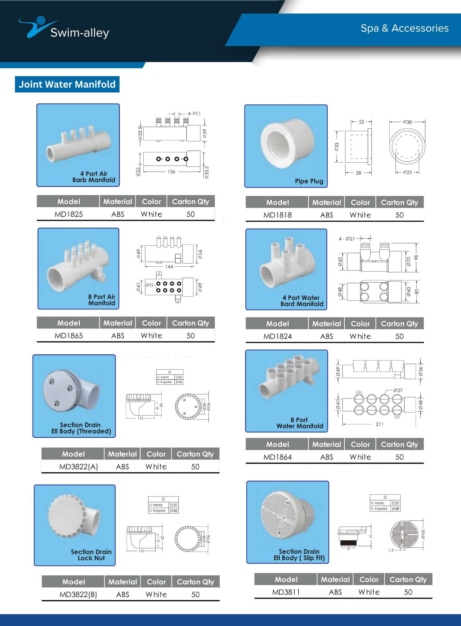 The Joint Water Manifold section within the Spa and Accessories category includes essential components that ensure efficient air and water distribution across spa systems. These products are designed to streamline plumbing connections and support smooth flow management. Offerings include 4 Port Air Barb Manifold, Pipe Plus, 8 Port Air Manifold, Section Drain, Ell Body (Threaded), Ell Body (Slip Fit), and many more.