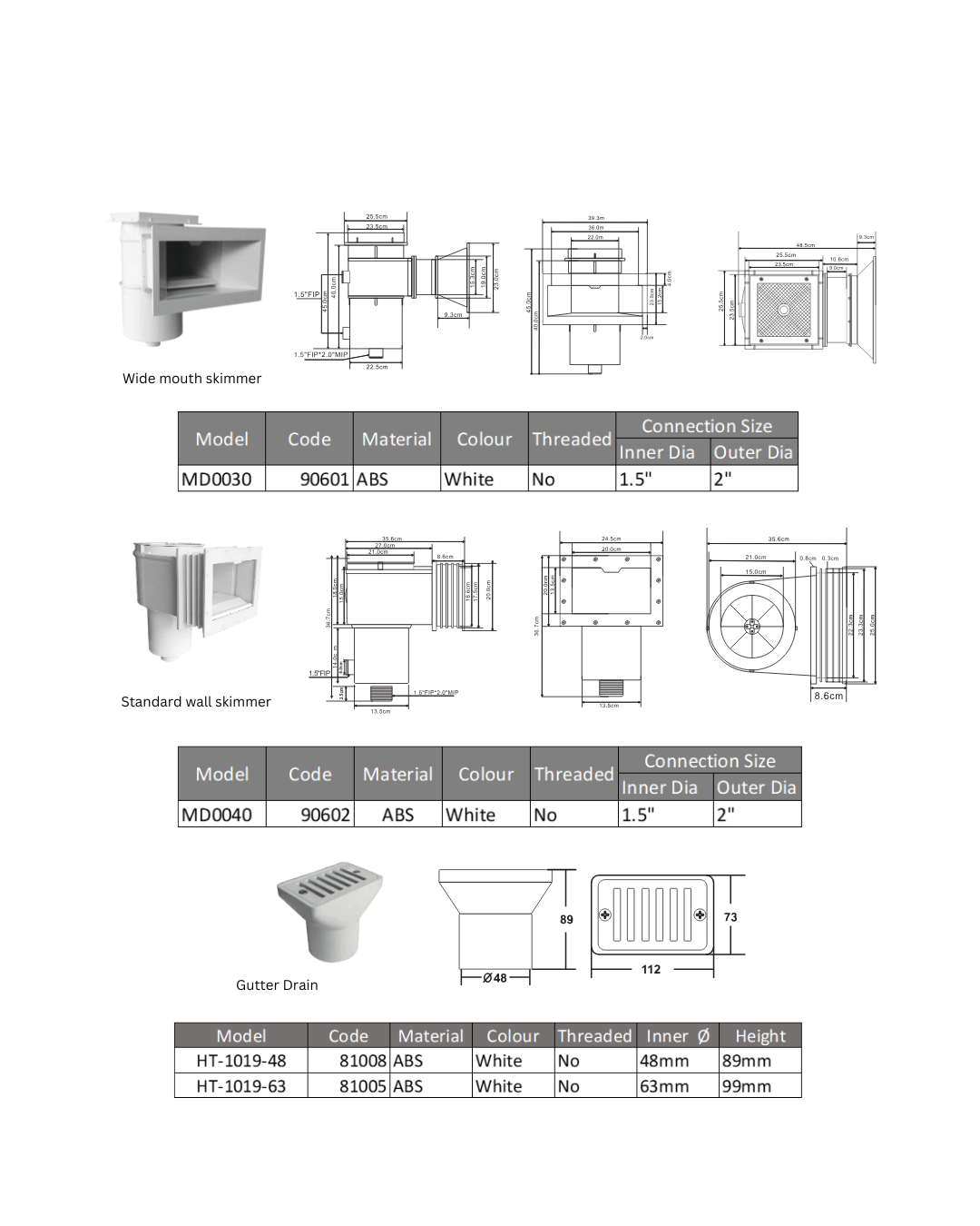Outlet Fittings are designed to efficiently remove water from the pool for filtration, cleaning, and recirculation. These components are essential for maintaining proper water levels, ensuring smooth water flow, and supporting the overall functionality of the pool system. The range includes wide mouth skimmers, standard wall skimmers, gutter drains, wall conduits, and many more—each engineered to perform specific outlet functions while maintaining safety and aesthetics.