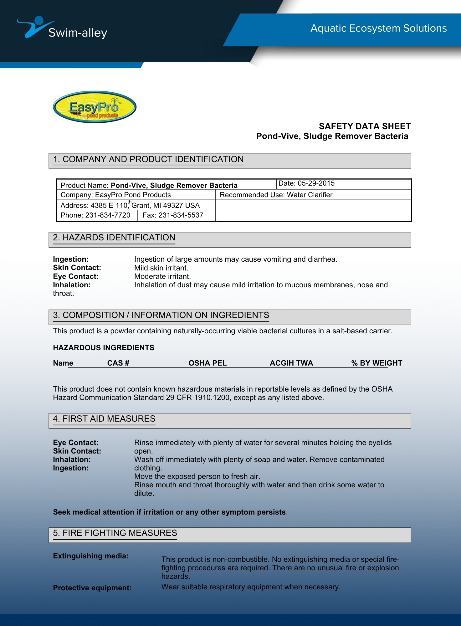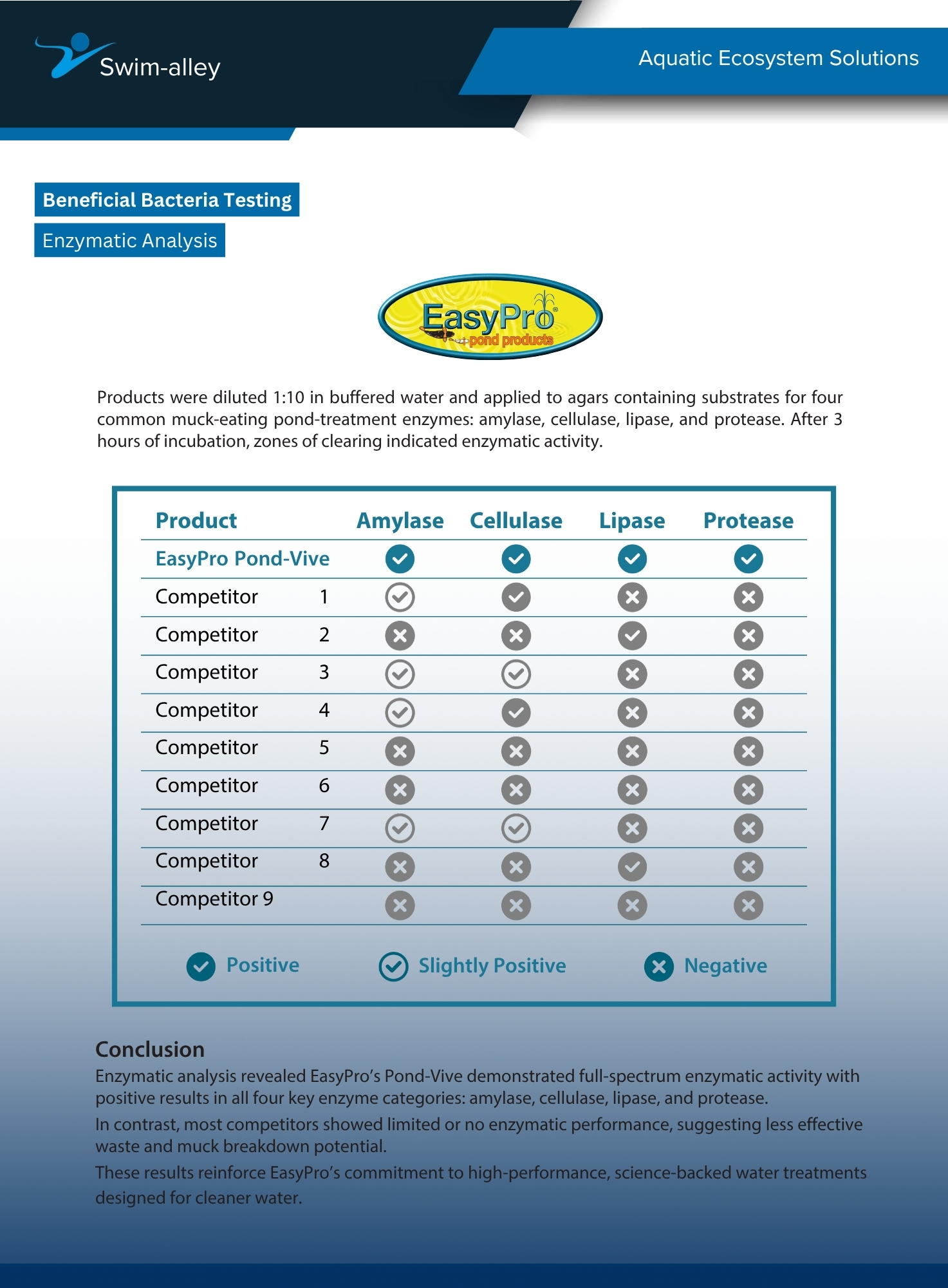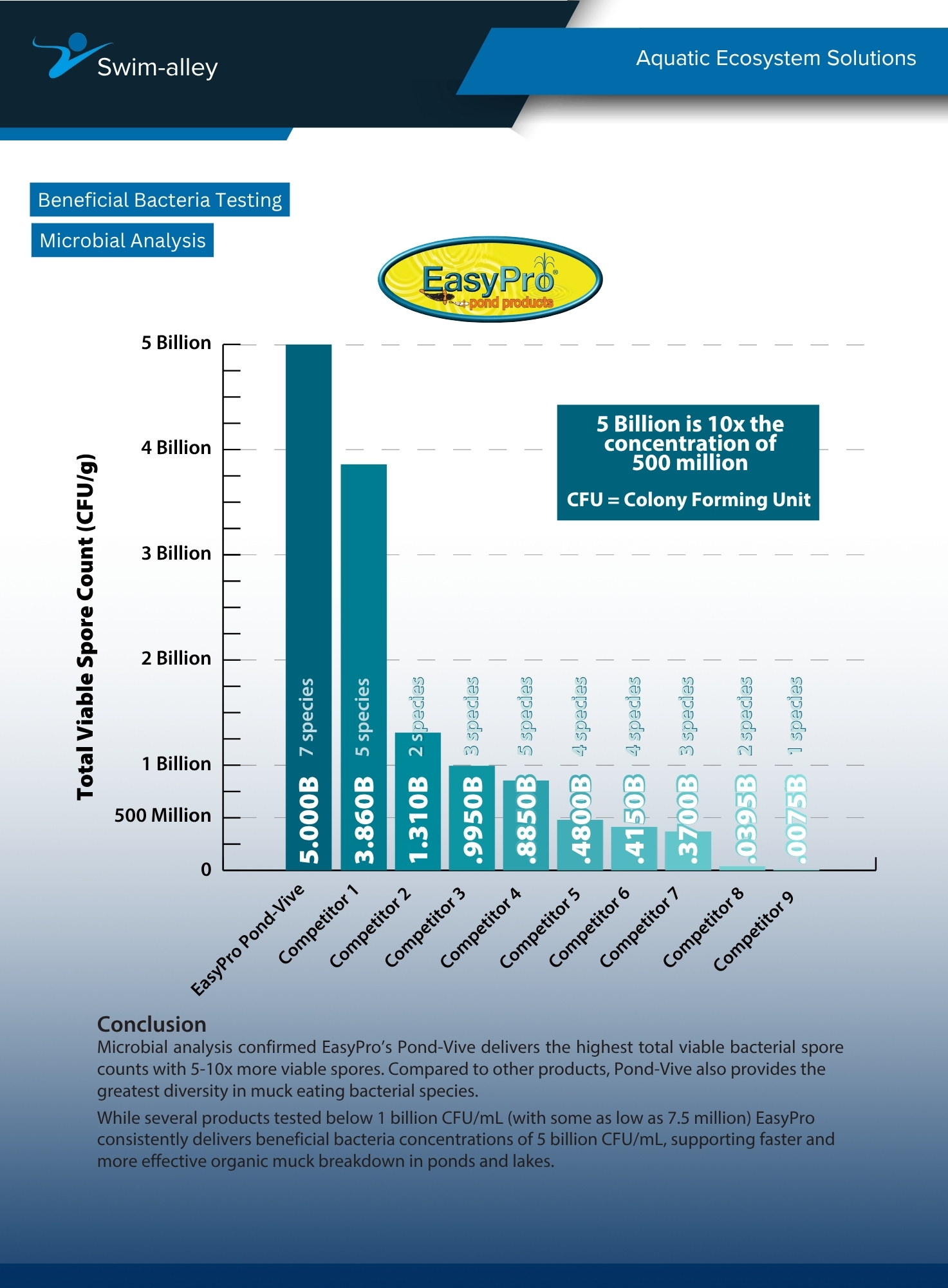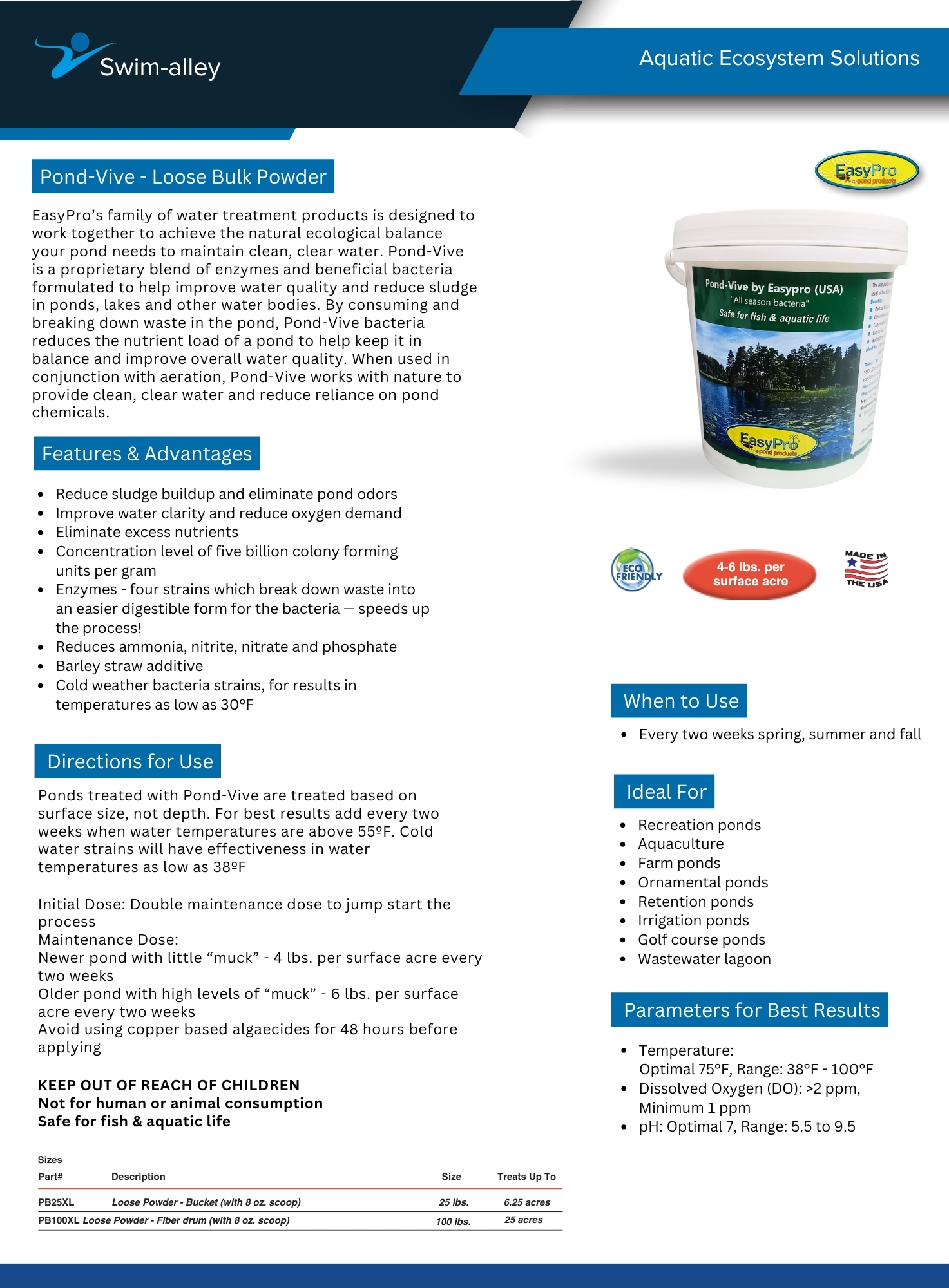 EasyPro’s family of water treatment products is designed to work together to achieve the natural ecological balance your pond needs to maintain clean, clear water. Pond-Vive is a proprietary blend of enzymes and beneficial bacteria formulated to help improve water quality and reduce sludge in ponds, lakes and other water bodies. By consuming and breaking down waste in the pond, Pond-Vive bacteria reduces the nutrient load of a pond to help keep it in balance and improve overall water quality. When used in conjunction with aeration, Pond-Vive works with nature to provide clean, clear water and reduce reliance on pond chemicals.