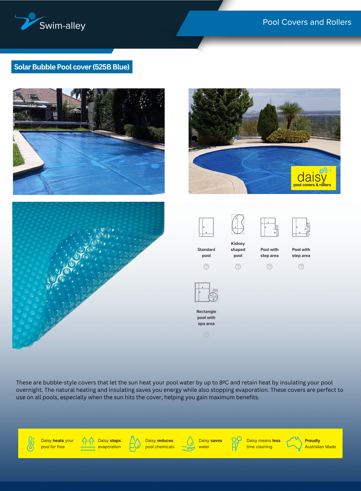 Daisy Pool Covers are high-quality, Australian-made bubble-style covers designed to capture and retain heat. Backed by years of research, they help raise water temperature by up to 8°C and reduce evaporation overnight. With superior insulation and energy-saving performance, these covers are ideal for all pool types and conditions. Built to handle Australia’s tough climate, Daisy delivers the original and best in pool cover technology.